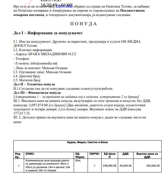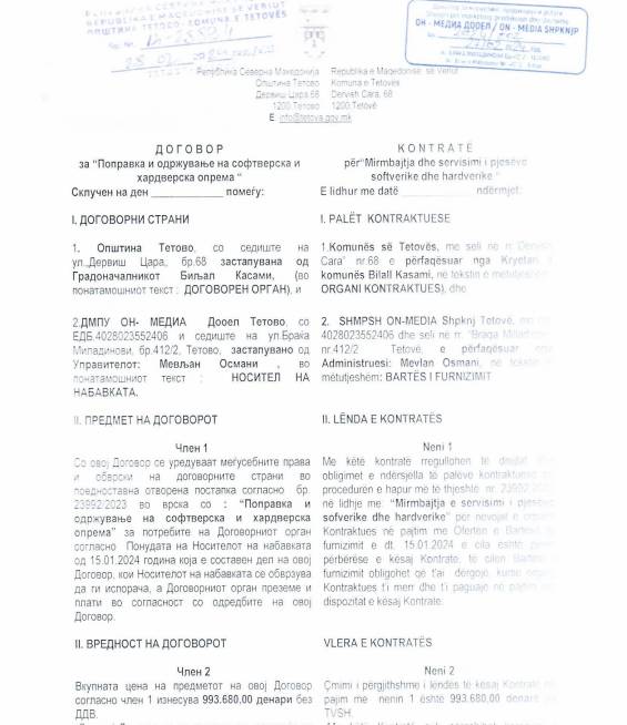 Ky tender nga Komuna e Tetovës kompanisë “On Media” i është dhënë për “Mirëmbajtje dhe servisim të pajisjeve hardverike dhe softverike” .